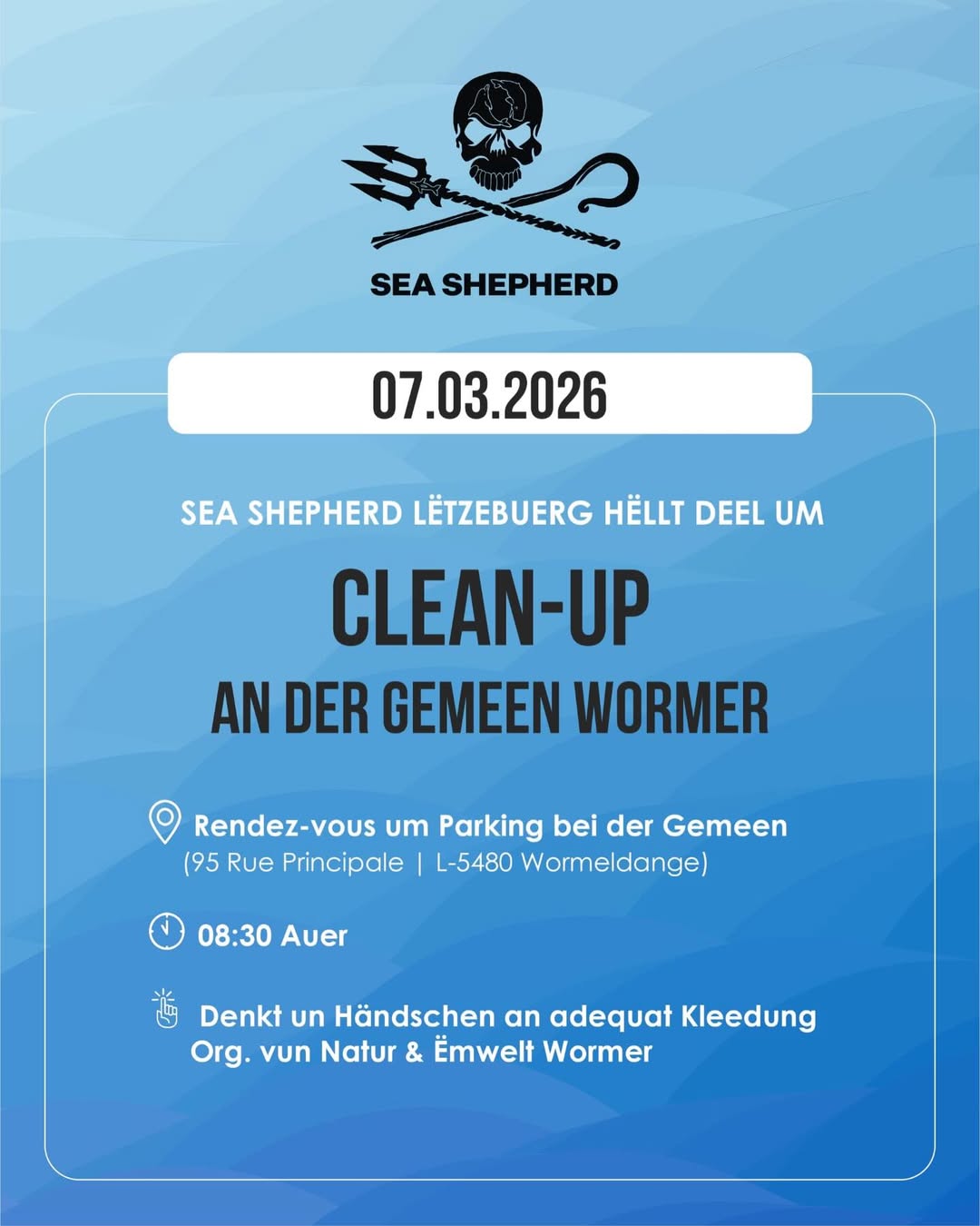 On Saturday, March 7, 2026, natur&ëmwelt Wormer is organizing a big clean-up. Sea Shepherd Luxembourg will also be picking up trash along the Moselle with a team. Do you want to do something good for nature? 📍 Meeting point is at 8:30 a.m. at the parking lot near the municipality.